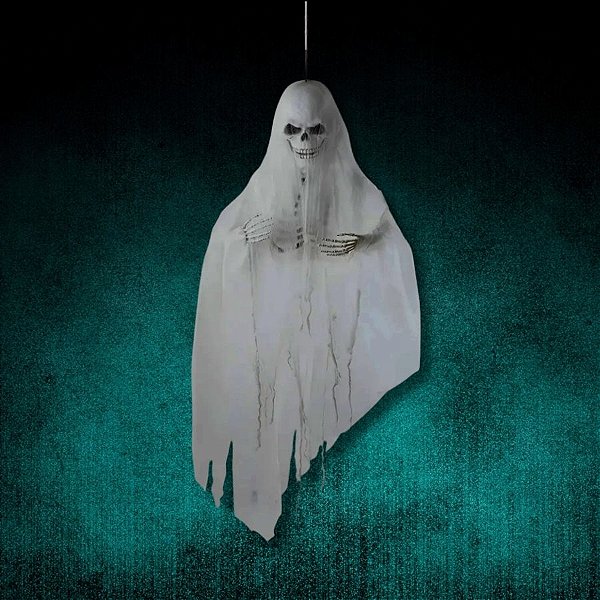 Caveira decorativa de Halloween. Possui roupa branca e mede 153cm.