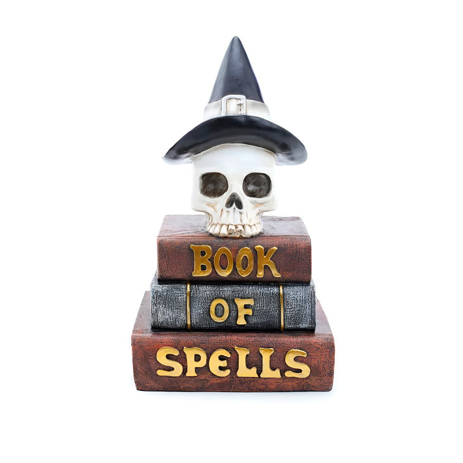 Crânio decorativo de Halloween, com chapéu do Shakespeare e livros embaixo escrito "Book Of Spells".