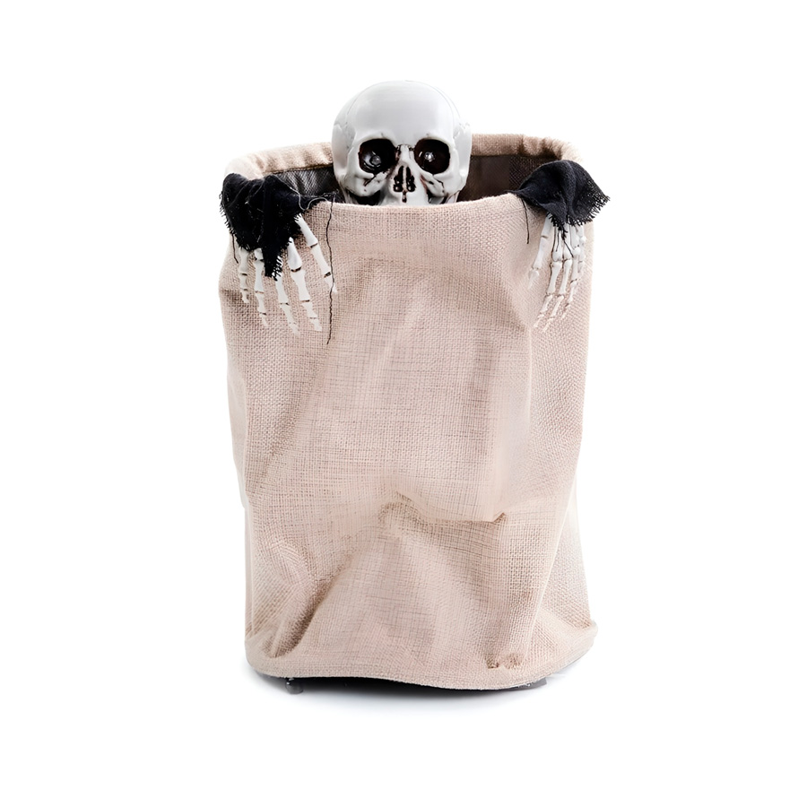 Esqueleto decorativo, quando acionado contém música de terror de fundo, luz vermelha nos olhos e sobe para fora da sua bolsa bege.