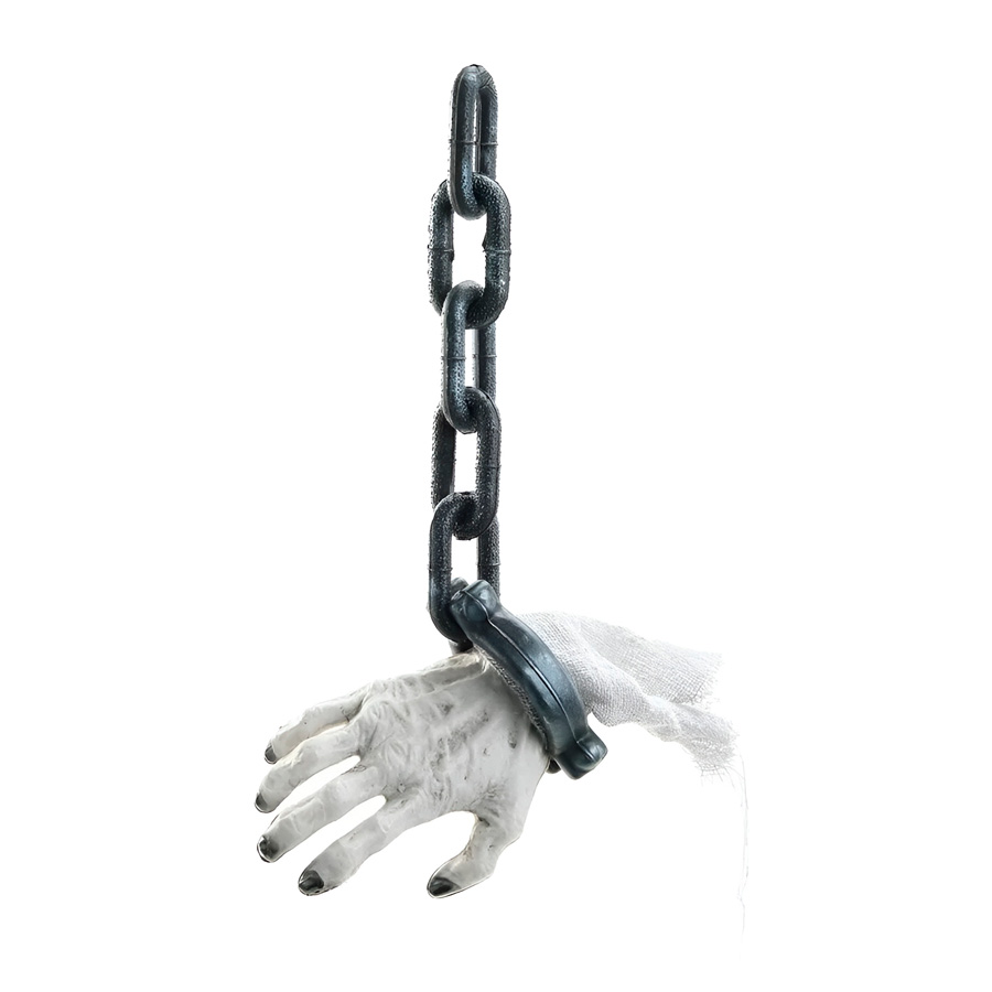 Mão amputada decorativa de Halloween, cor branca, conta com corrente cinza e faixa na base.