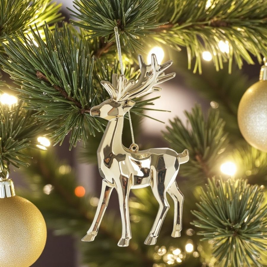 O enfeite rena dourada é versátil e harmoniza facilmente com outros enfeites, como bolas, laços, estrelas e luzes de LED, criando cenários natalinos sofisticados e encantadores. Perfeito para decorações residenciais, vitrines, festas temáticas ou lembrancinhas, ele transforma pequenos detalhes em pontos de destaque, elevando o espírito natalino em cada ambiente.