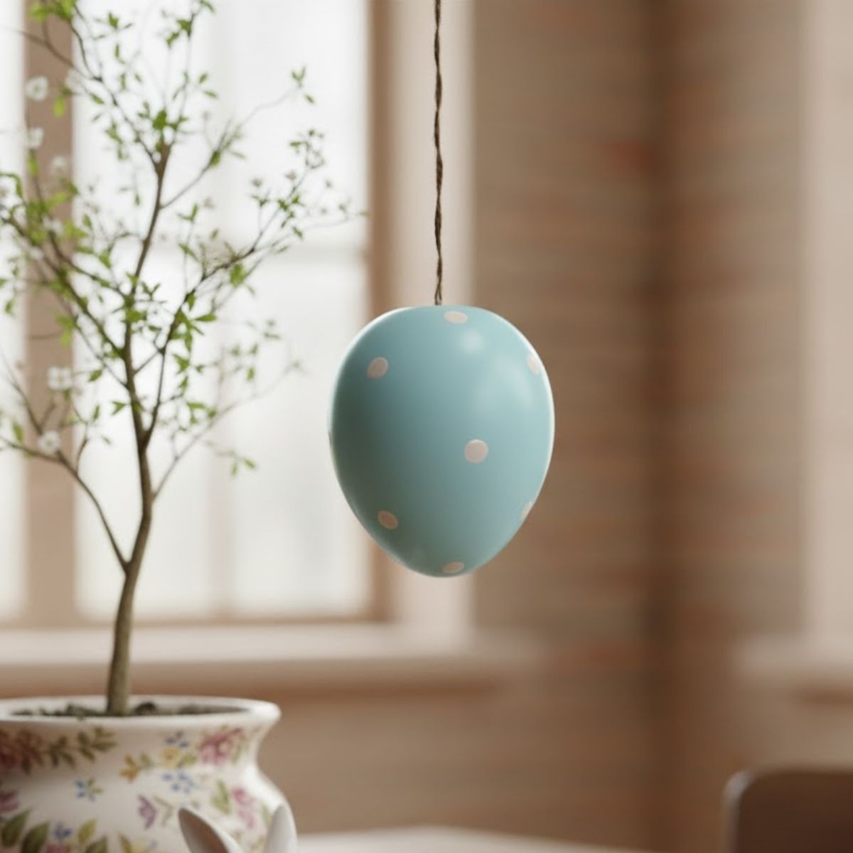O Enfeite Para Pendurar de Páscoa – Ovo Azul com Bolinhas – 15cm é uma peça delicada e charmosa para transformar qualquer ambiente no clima pascoalino. Ele possui formato de ovo, com um tom azul pastel suave e detalhes de bolinhas brancas, garantindo um visual leve, alegre e perfeito para decorações modernas e temáticas. Com 15cm, é um tamanho ótimo para destacar em árvores de Páscoa, guirlandas, arranjos, portas, janelas ou até mesmo em embalagens especiais.