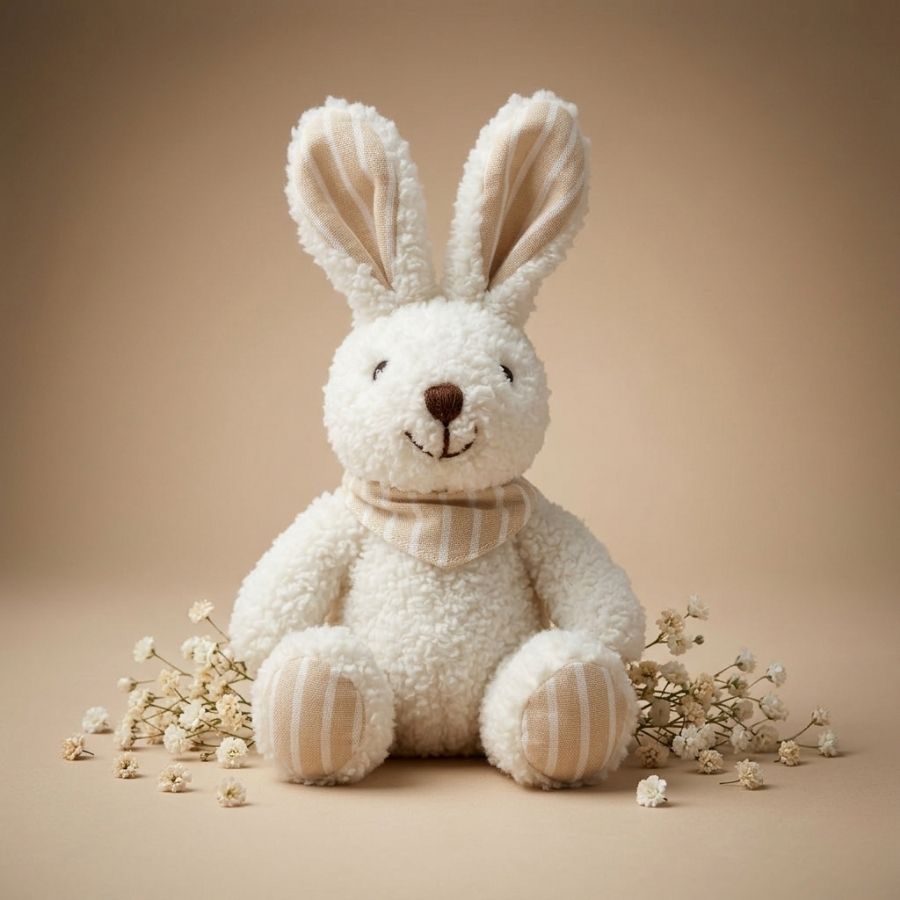 Enfeite decorativo de Páscoa para pendurar em formato de coelho com lenço na cor bege, medindo aproximadamente 15x7cm, ideal para decorar árvores de Páscoa, galhos e arranjos temáticos.