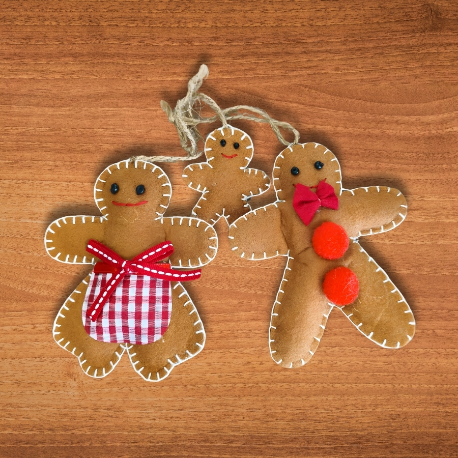 Enfeite natalino para pendurar em formato de família Gingerbread, medindo 9x12x2cm. Indicado para árvores, guirlandas e decoração de ambientes festivos, unindo diversão e praticidade.