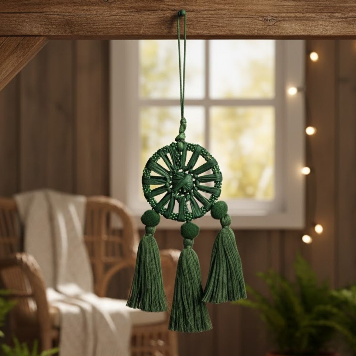 O Enfeite Para Pendurar - Filtro dos Sonhos - Verde Escuro - 14cm é uma peça encantadora que une estilo e significado. Com tons de verde escuro, ele transmite sensação de equilíbrio e conexão com a natureza, além de simbolizar proteção e boas energias. Seu design artesanal e detalhes delicados fazem dele uma escolha perfeita para quem busca uma decoração com personalidade e um toque espiritual.