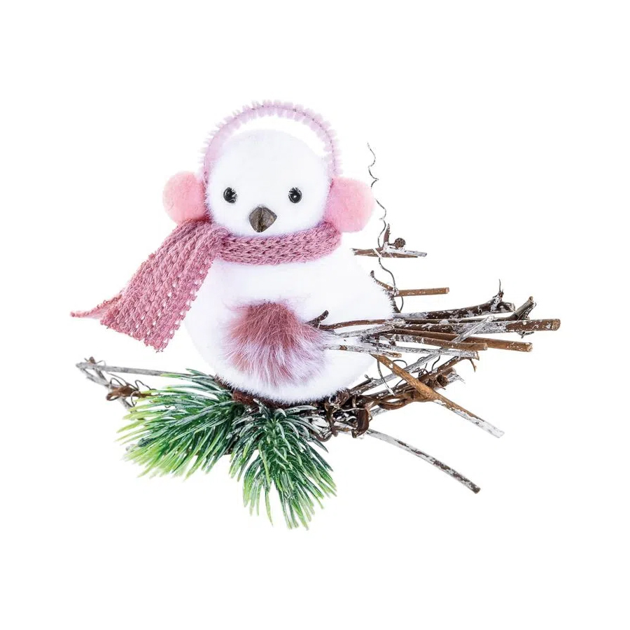 Enfeite para Pendurar Pássaro de isopor revestido em tecido no galho, usando cachecol e protetor de orelhas rosa.