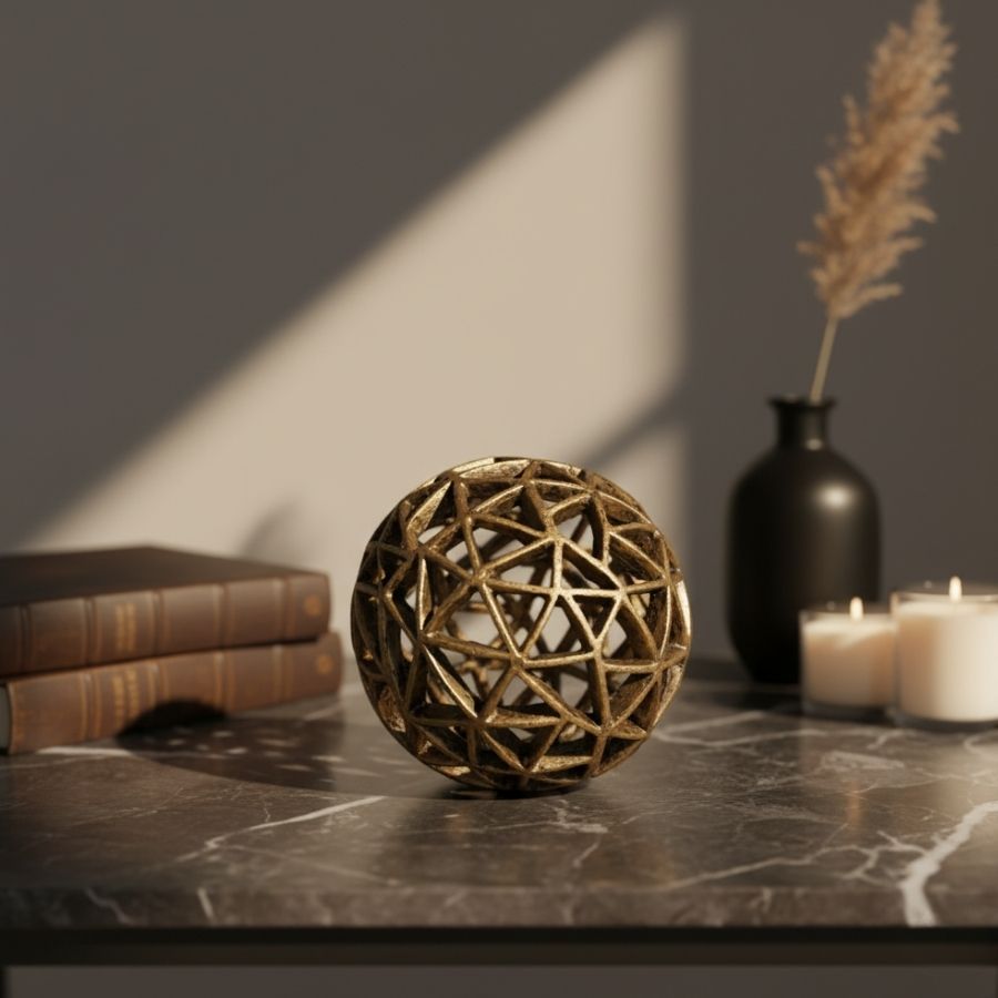 Esfera decorativa em poliresina dourada com design geométrico inspirado na arquitetura Mughal, ideal para decorar ambientes com estilo e elegância no Home Decor.