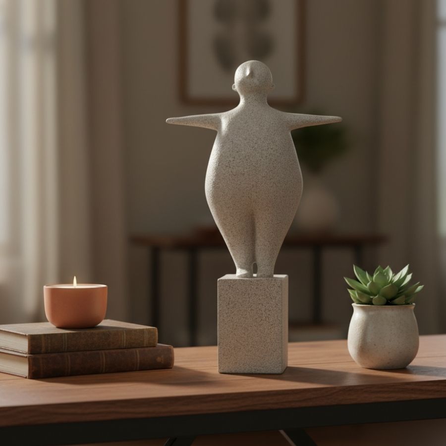 Produzida em poliresina com acabamento que imita a textura de pedra ou cimento, a peça apresenta tom bege claro salpicado, reforçando o visual natural e elegante. A figura humana estilizada possui corpo arredondado e braços estendidos horizontalmente, apoiada sobre uma base cúbica simples. Com dimensões de 19,5x12x4cm, é ideal para decorar salas, escritórios, quartos ou estantes, sendo também uma excelente opção para presentear quem aprecia detalhes artísticos e Home Decor contemporâneo.
