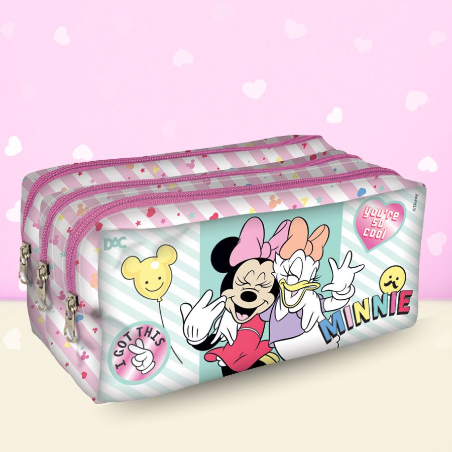 O Estojo Triplo com Zíper inspirado na Minnie Mouse Disney é ideal para organizar materiais escolares de forma prática e funcional no dia a dia. O modelo possui três divisórias independentes, cada uma com zíper, formando três bolsos que facilitam a separação de canetas, lápis, canetinhas, marcadores, borracha, apontador e outros itens de papelaria. Essa estrutura de estojo triplo, com três partes bem distribuídas, contribui para uma rotina escolar mais organizada durante aulas, estudos e atividades criativas. O visual temático da Minnie Mouse Disney adiciona um toque delicado e encantador ao material de papelaria.