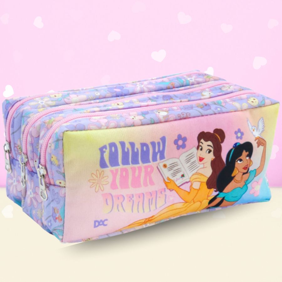 O Estojo Triplo com Zíper inspirado nas Princesas Disney é ideal para organizar materiais escolares de forma prática e funcional no dia a dia. O modelo possui três divisórias independentes, cada uma com zíper, formando três bolsos que facilitam a separação de canetas, lápis, canetinhas, marcadores, borracha, apontador e outros itens de papelaria. Essa estrutura de estojo triplo, com três partes bem distribuídas, contribui para uma organização eficiente durante aulas, estudos e atividades criativas. O visual temático das Princesas Disney adiciona um toque delicado e encantador ao material escolar.