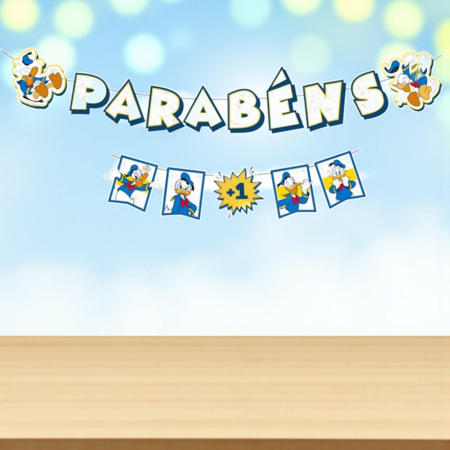 A faixa decorativa Pato Donald Disney é perfeita para deixar a festa ainda mais alegre e encantadora. O produto inspirado no Pato Donald Disney é composto por duas faixas: uma com a palavra “Parabéns” e outra com figuras divertidas e aleatórias do personagem. As peças já vêm furadas e acompanham barbante para montagem e pendurar onde desejar, proporcionando praticidade e um visual encantador à decoração.