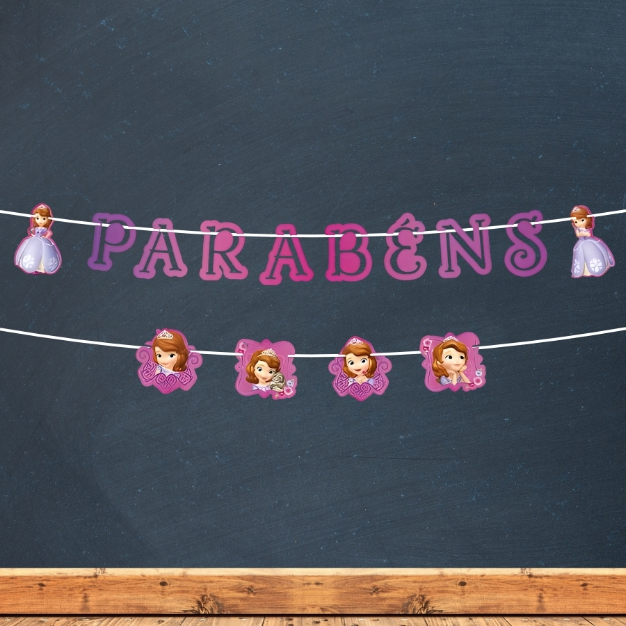 A Faixa Decorativa "Parabéns" Sofia The First mede 115x13cm e apresenta estampa temática da princesa. Indicada para festas infantis, aniversários e eventos comemorativos com o tema Sofia The First.