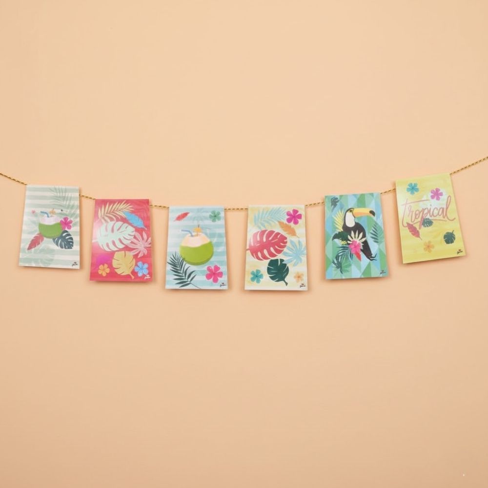 Com comprimento total de 1,6m, a faixa é perfeita para decorar festas, varandas, paredes, mesas, painéis ou ambientes internos e externos cobertos. O contraste entre as estampas coloridas e o fitilho dourado deixa a decoração ainda mais charmosa, sendo ideal para festas tropicais, aniversários, eventos temáticos ou decorações descontraídas.