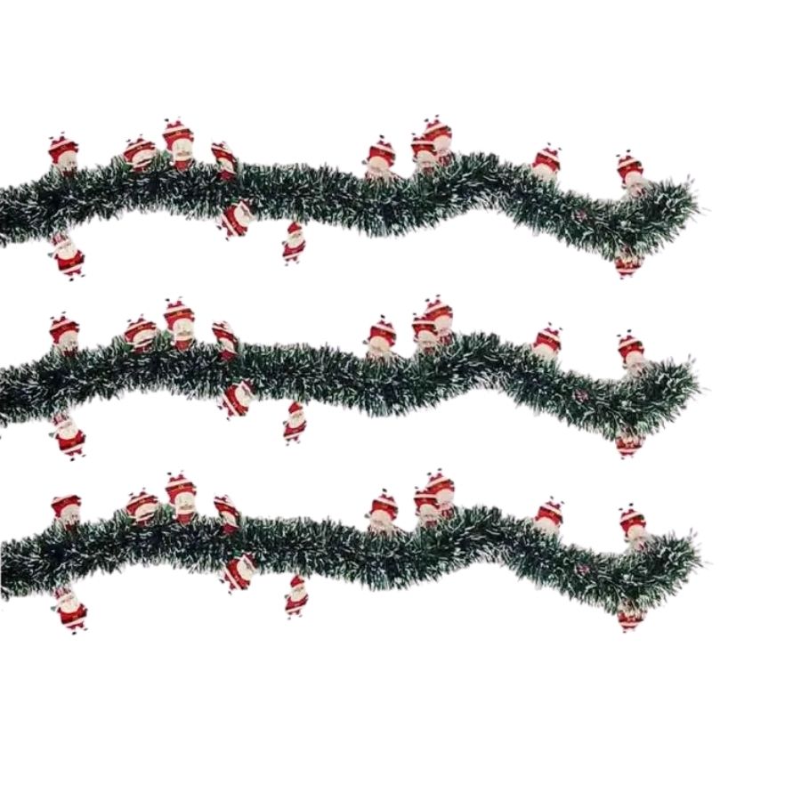 O Festão de Natal Aramado - Noel - Verde Escuro Nevado - 7x200cm é o toque festivo perfeito para transformar qualquer ambiente em um cenário natalino encantador. Com estrutura aramada e galhos verdes com efeito nevado, ele transmite o espírito do inverno e da celebração de fim de ano. Ao longo de todo o festão, há pequenos bonecos de Papai Noel feitos em plástico translúcido colorido, vestindo gorros e roupas vermelhas e brancas, que trazem brilho e alegria para a decoração.