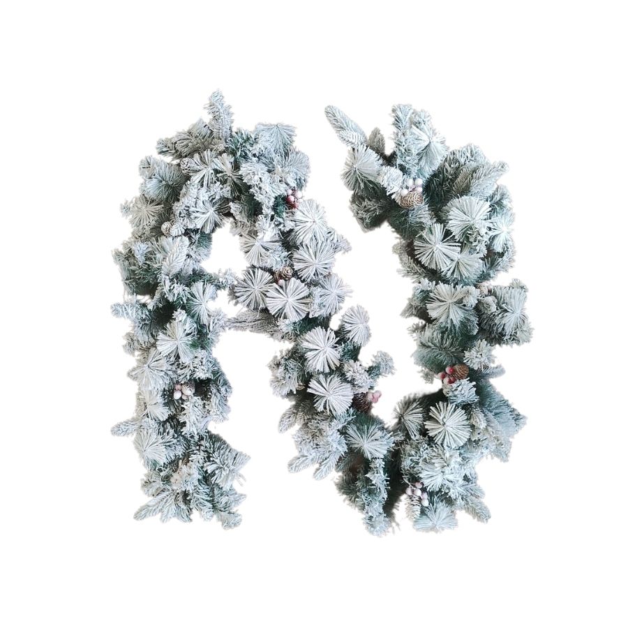 O festão de Natal Nevado de 180 galhos e 2,70m oferece uma decoração natalina encantadora e sofisticada, com efeito de neve realista e material durável, perfeito para escadas, lareiras e portas.