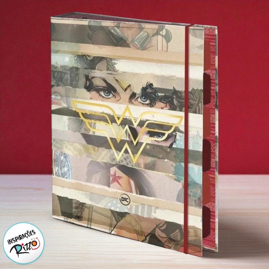 Fichário A5 - Mulher Maravilha - 18,5x25,1cm Com design poderoso e elegante, este fichário A5 possui capa com laminação fosca e o icônico emblema da Mulher Maravilha em hot stamping prata, trazendo destaque e personalidade à sua papelaria. Conta com fechamento em elástico, estrutura com quatro furos e argolas metálicas, ideal para acompanhar a rotina escolar, do trabalho ou da organização pessoal.