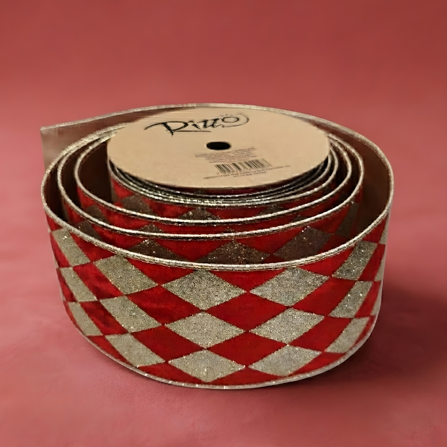 Fita aramada decorativa com estampa losango nas cores vermelho e dourado, medindo aproximadamente 6,3cm de largura por 9,14 metros de comprimento. Possui arame nas bordas, permitindo modelagem e fixação de formas. Indicada para uso decorativo em laços, embalagens e composições temáticas. Pode apresentar variações no padrão da estampa. Recomenda-se evitar contato com umidade para preservar as características do produto.