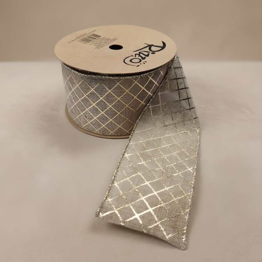 Fita aramada decorativa com estampa quadriculada na cor dourada, medindo aproximadamente 6,3cm de largura por 9,14 metros de comprimento. Possui arame nas bordas, permitindo modelagem e fixação de formas. Indicada para uso decorativo em laços, embalagens e composições temáticas. Pode apresentar variações no padrão da estampa. Recomenda-se evitar contato com umidade para preservar as características do produto.