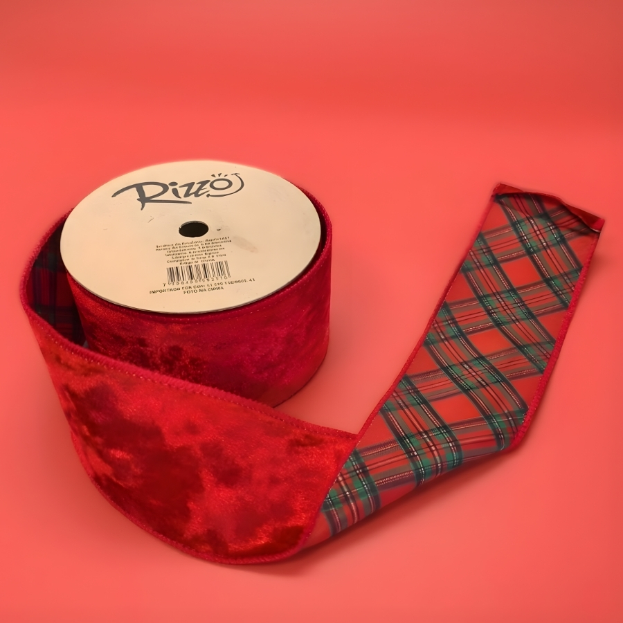 Fita aramada decorativa com acabamento em veludo na cor vermelha, medindo aproximadamente 6,3cm de largura por 9,14 metros de comprimento. Possui arame nas bordas, permitindo modelagem e fixação de formas. Indicada para uso decorativo em laços, embalagens e composições temáticas. Recomenda-se evitar contato com umidade e atrito excessivo para preservar o acabamento em veludo.