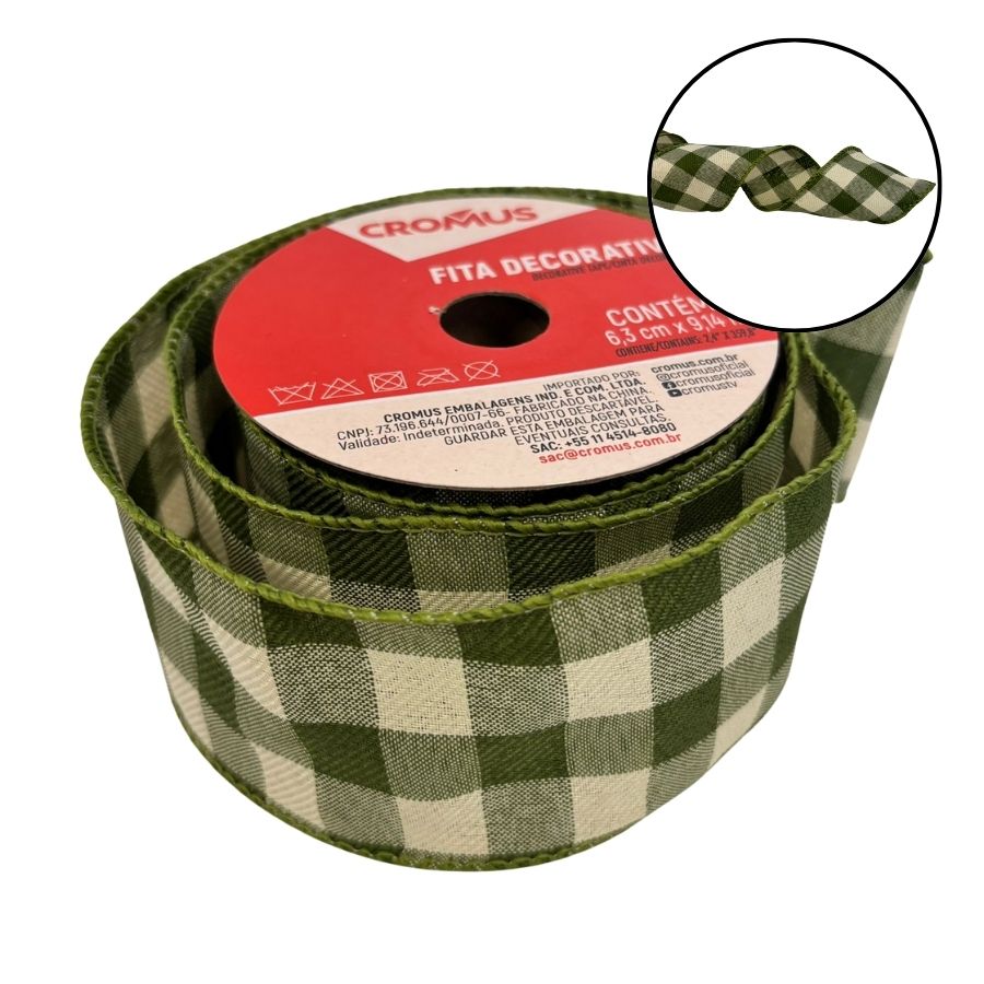 A Fita Decorativa de Natal - Xadrez Verde - 6,3cmx9,14m é perfeita para dar um toque especial à sua decoração natalina. Com estampa xadrez em verde, ela combina tradição e charme, podendo ser usada em árvores de Natal, guirlandas, laços para presentes, arranjos de mesas e outros detalhes festivos. Seu comprimento de 9,14 metros oferece várias possibilidades de uso em decorações pequenas e grandes.