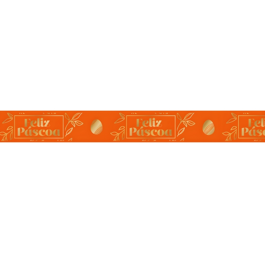 Essa fita resolve a necessidade de comunicar a temática da Páscoa de forma clara e visualmente atrativa, ajudando a chamar a atenção do consumidor no ponto de venda. A estampa Feliz Páscoa em dourado reforça a mensagem comemorativa, agrega valor às embalagens e transmite cuidado nos detalhes, sem exigir complementos adicionais na finalização.