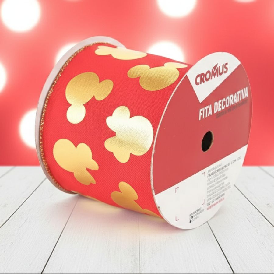 Sonhe, realize e comemore com a Fita Decorativa Aramada inspirada no Mickey Mouse Disney, criada para transformar qualquer composição com charme festivo. O design em vermelho vibrante com textura semelhante ao linho ganha ainda mais destaque com a estampa licenciada Disney em hotstamping dourado, trazendo as silhuetas do Mickey Disney e da Minnie Disney em um brilho elegante. A estrutura aramada permite modelar facilmente laços volumosos e acabamentos impecáveis, perfeita para arranjos, guirlandas, embalagens e decorações temáticas.