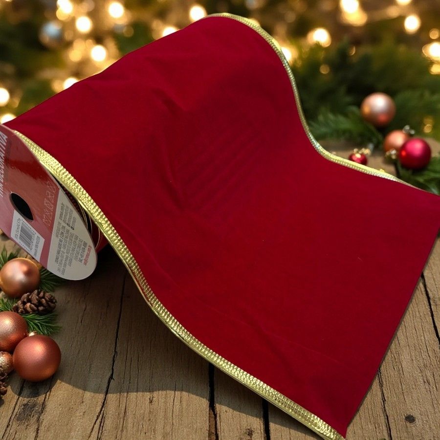 Com largura de 15cm e comprimento de 457cm, a fita natalina garante versatilidade no uso, permitindo criar laços grandes, envolver decorações ou personalizar enfeites e lembrancinhas. Sua textura macia de veludo e acabamento dourado tornam a peça um detalhe especial que transforma qualquer composição em algo único e festivo.