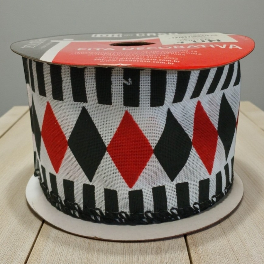 Fita decorativa com estampa de losangos vermelhos e pretos, medindo 6,3cm de largura por 914cm de comprimento. Indicada para laços, arranjos e aplicações decorativas diversas.