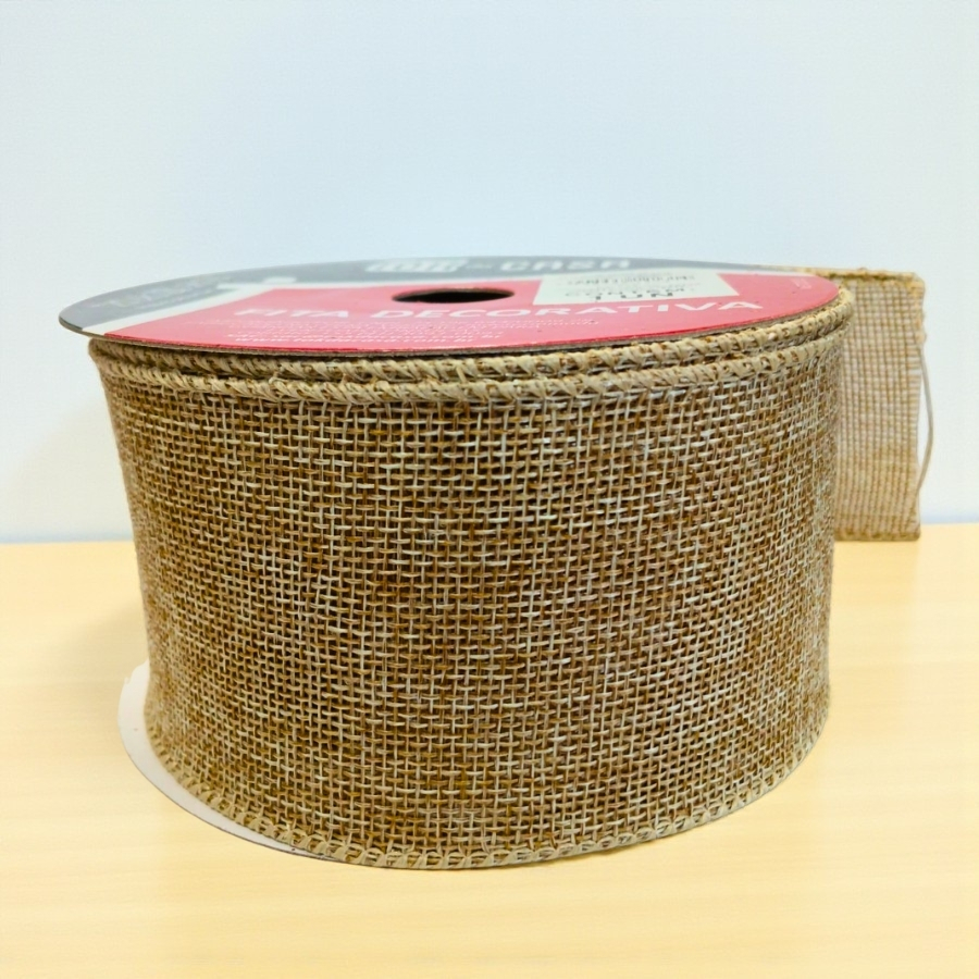 Fita decorativa em material natural de cor bege, medindo 6,3cm de largura e 914cm de comprimento. Ideal para artesanato, embalagens personalizadas, laços e decorações rústicas ou temáticas.