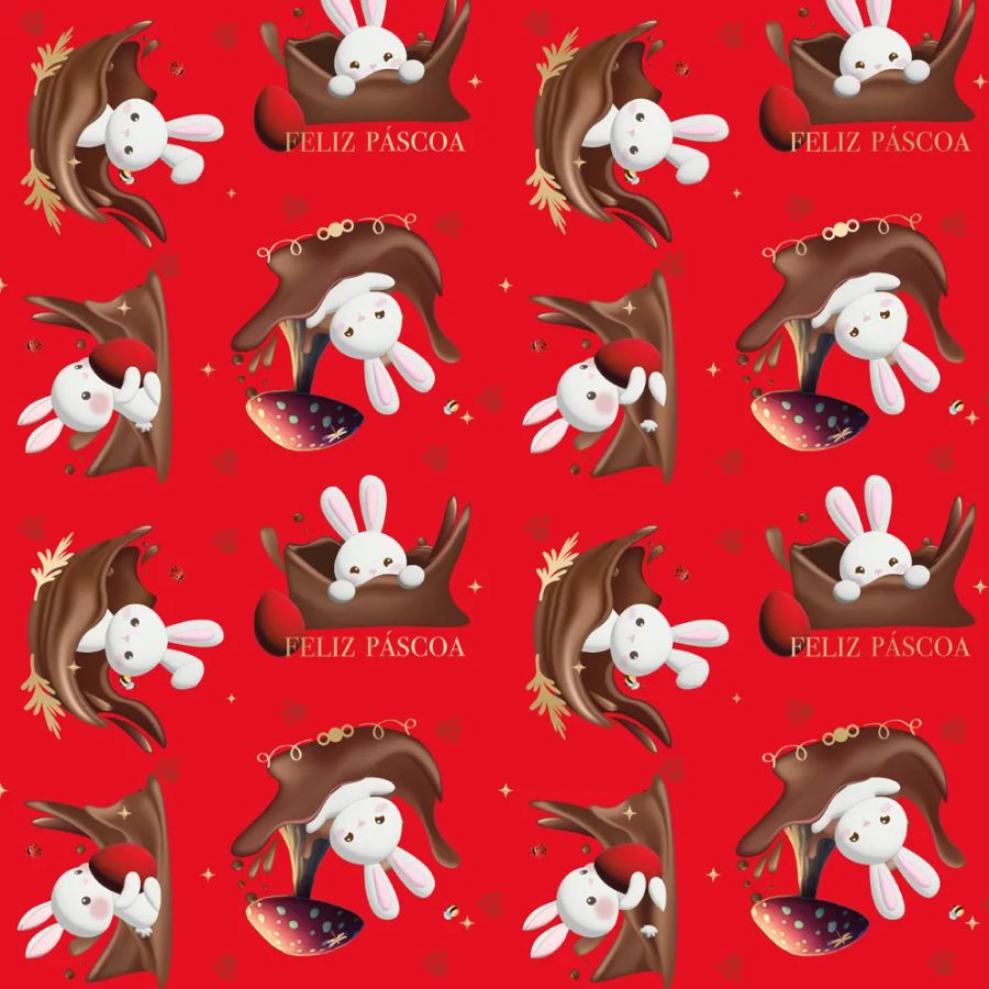Folha decorativa "Contos de Páscoa" vermelha, tamanho 69x89 cm, ideal para embalar ovos de Páscoa com charme e elegância.