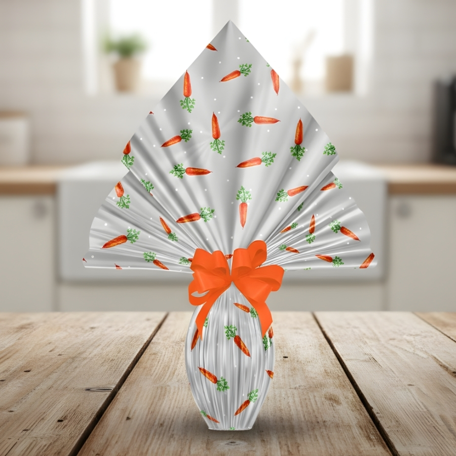 A Folha Poli Páscoa Transparente - 70x90cm - Cenoura é utilizada para embalar e decorar ovos de chocolate, cestas e kits de Páscoa. Produzida em material poli transparente estampado, combina resistência, flexibilidade e acabamento decorativo, ideal para uso profissional e comercial.