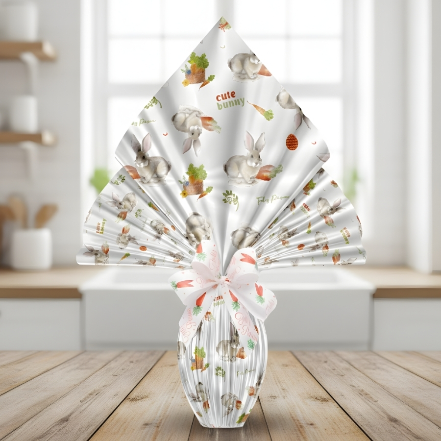 No tamanho 70x90cm, oferece ampla cobertura para embalar produtos de maior porte com praticidade e segurança. O material poli transparente é flexível e resistente, facilitando o manuseio, dobras e amarrações com fitas e laços decorativos. A estampa temática reforça o apelo pascal, agregando valor estético e maior percepção de qualidade ao produto final.
