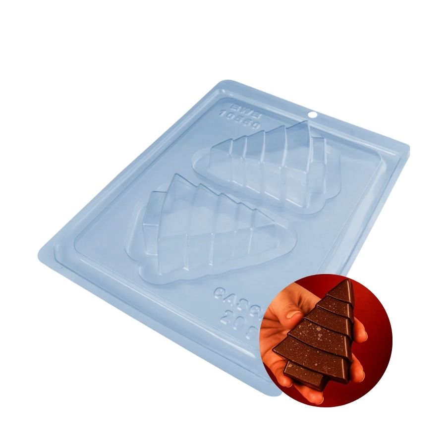 Forma especial com duas cavidades para produzir árvores de Natal médias, ideal para chocolates temáticos de alto valor agregado e produção sazonal com padrão profissional.