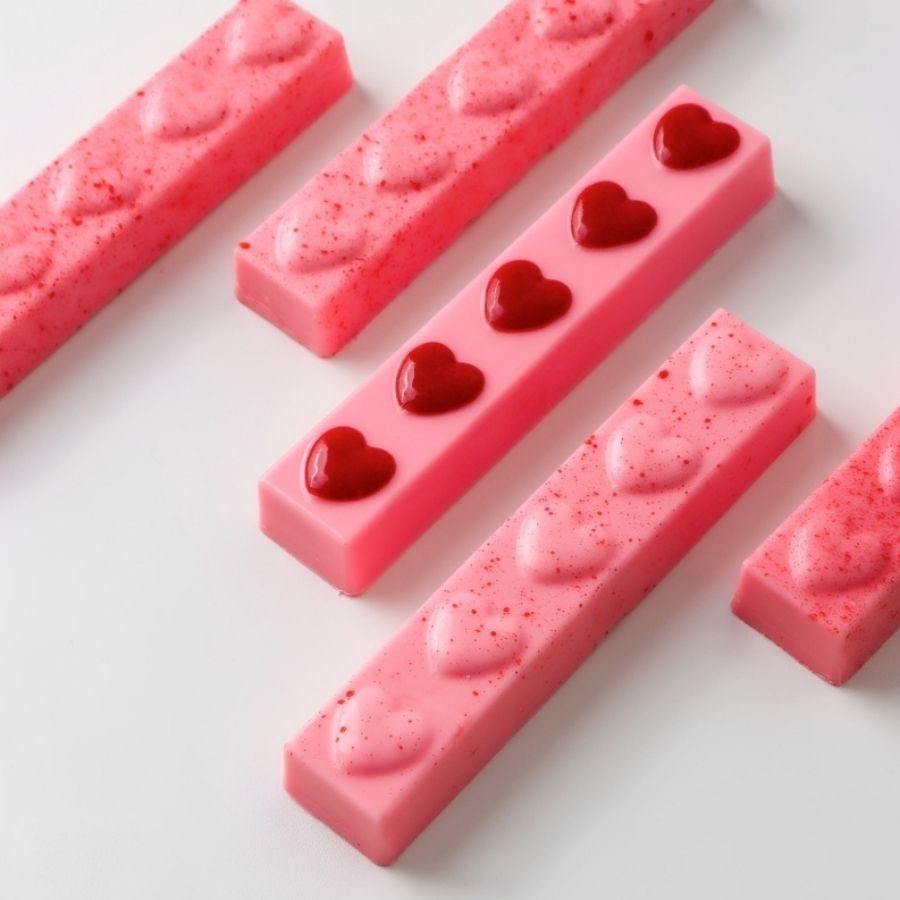 Forma especial de acetato com 3 partes sendo uma delas flexível, com o formato de um barrinha retangular com corações