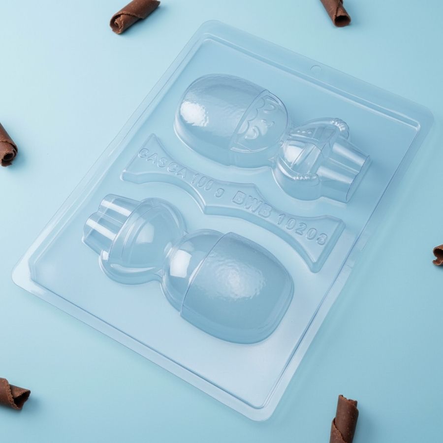A Forma de Acetato Especial – Menino da Guarda Britânica é indicada para a produção de chocolates artesanais com alto padrão de acabamento, sendo ideal para chocolaterias, confeiteiros, pequenos produtores e ateliês. Trata-se de uma forma especial com silicone (3 partes), composta por 2 partes rígidas em acetato e 1 parte flexível em silicone, que garante maior praticidade e precisão no processo produtivo. Possui 2 cavidades (1 conjunto), com dimensões da cavidade de 13,5 cm de comprimento, 6,1 cm de largura e 2,1 cm de altura, permitindo a criação de chocolates detalhados e bem estruturados.