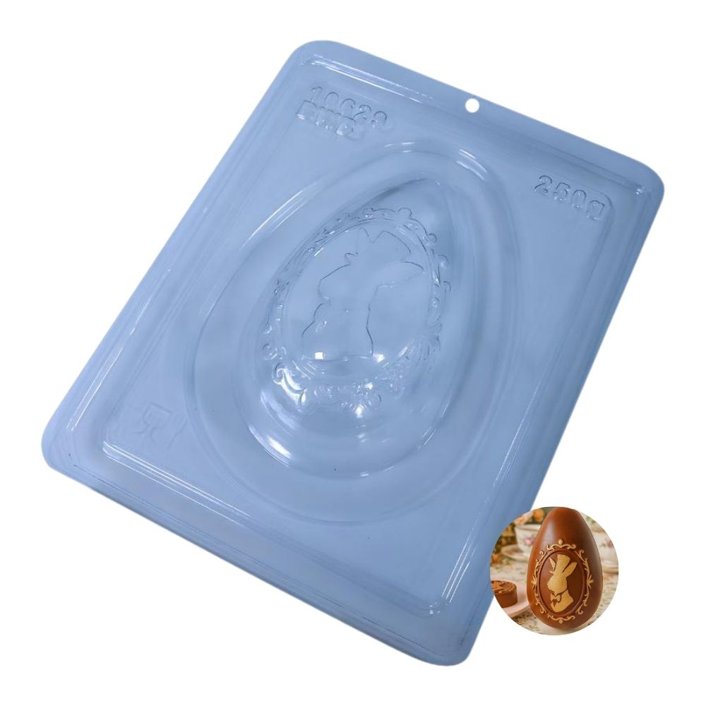 A forma de acetato especial é ideal para a produção de ovos de chocolate com acabamento refinado e alto padrão de qualidade. O modelo Ovo Clássico do Coelho foi desenvolvido para criar peças detalhadas e elegantes, perfeitas para produções artesanais e profissionais. O design apresenta um coelho de terno ricamente trabalhado, com arabescos delicados que formam uma moldura ao redor do personagem, garantindo um visual sofisticado e marcante no chocolate.