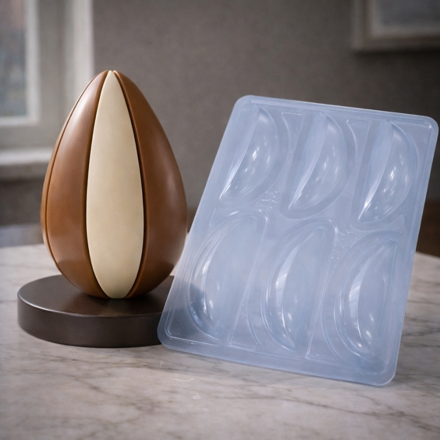 Este modelo especial possui três partes, sendo duas partes rígidas em acetato e uma parte flexível em silicone, garantindo casquinhas uniformes, excelente acabamento e padronização de peso. A forma conta ainda com marcação interna que indica a quantidade ideal de chocolate, evitando desperdícios e facilitando a produção com consistência e precisão. É uma opção versátil para confeiteiros que buscam inovação e diferenciação nos ovos de Páscoa.