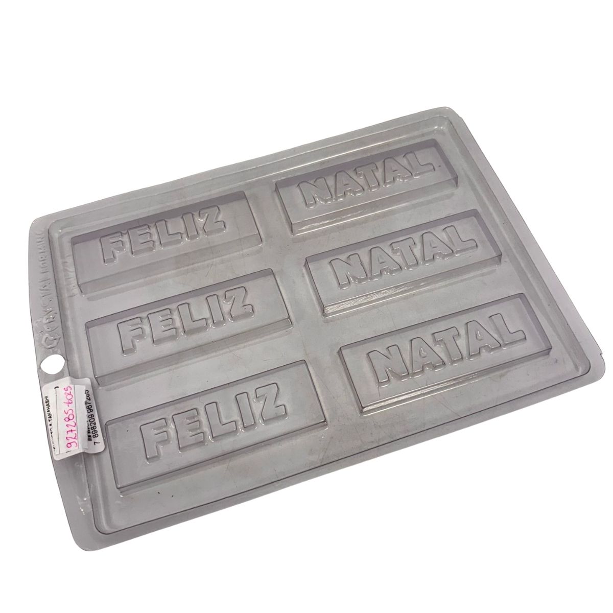 A Forma de Acetato Mini Barra de Chocolate "Feliz Natal" - Ref.6025 é perfeita para criar mini barras temáticas que encantam em qualquer ocasião natalina. Com 6 cavidades, cada uma medindo 8,5x3cm, ela traz em relevo a frase “Feliz Natal”, garantindo um acabamento profissional e personalizado aos chocolates. Produzida em acetato resistente e transparente, proporciona brilho, fácil desmoldagem e praticidade na produção.