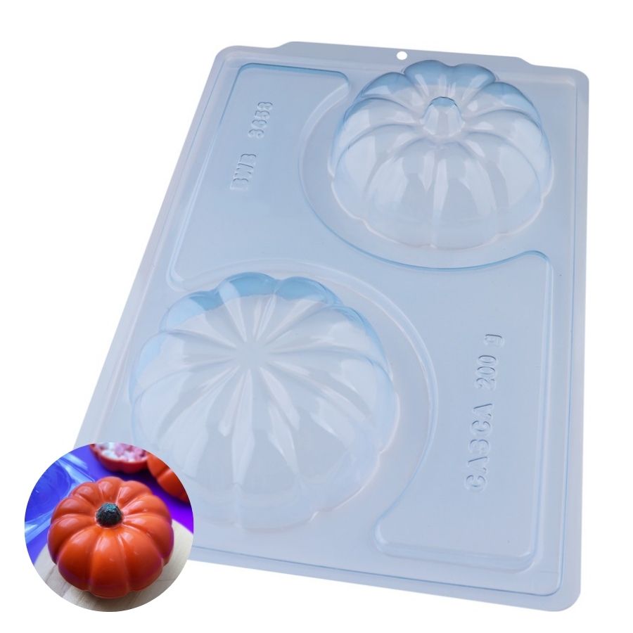A Forma Especial de Acetato - Abóbora Grande Halloween 3 Partes, que são duas rígidas e uma flexível, é ideal para quem deseja criar uma abóbora de chocolate em tamanho maior e com acabamento impressionante. Com 2 cavidades de aproximadamente 12,5x5cm cada, o molde traz a parte de cima e a parte de baixo da abóbora separadas, perfeitas para serem unidas após o chocolate endurecer, formando uma peça completa e tridimensional.