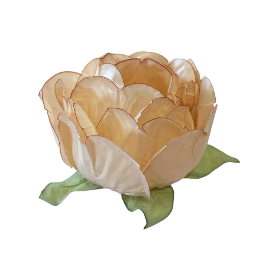 Forminhas para doces finos em formato de flor, com pétalas na cor vanilla matte, com folhas na cor verde