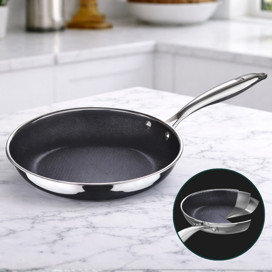 Corpo triplo em aço inoxidável com revestimento antiaderente de alta performance protegido por malha inox tipo favo de mel. Cabo em aço inox, resistente ao calor e próprio para uso em forno.