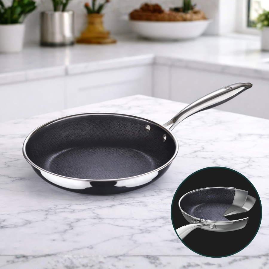 Corpo triplo em aço inoxidável com revestimento antiaderente de alta performance protegido por malha inox tipo favo de mel. Cabo em aço inox, resistente ao calor e próprio para uso em forno.
