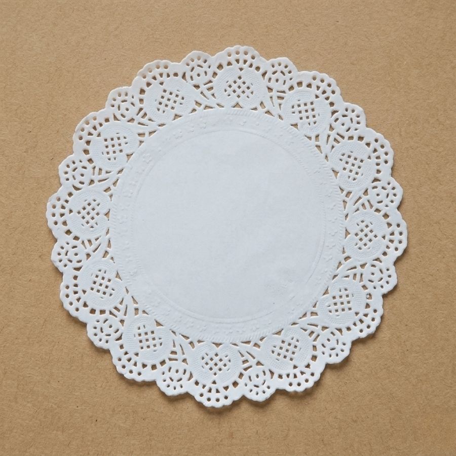 Fundo rendado de papel branco com 35 cm, ideal para decorar e valorizar a apresentação de doces, bolos, bandejas e produtos de confeitaria.