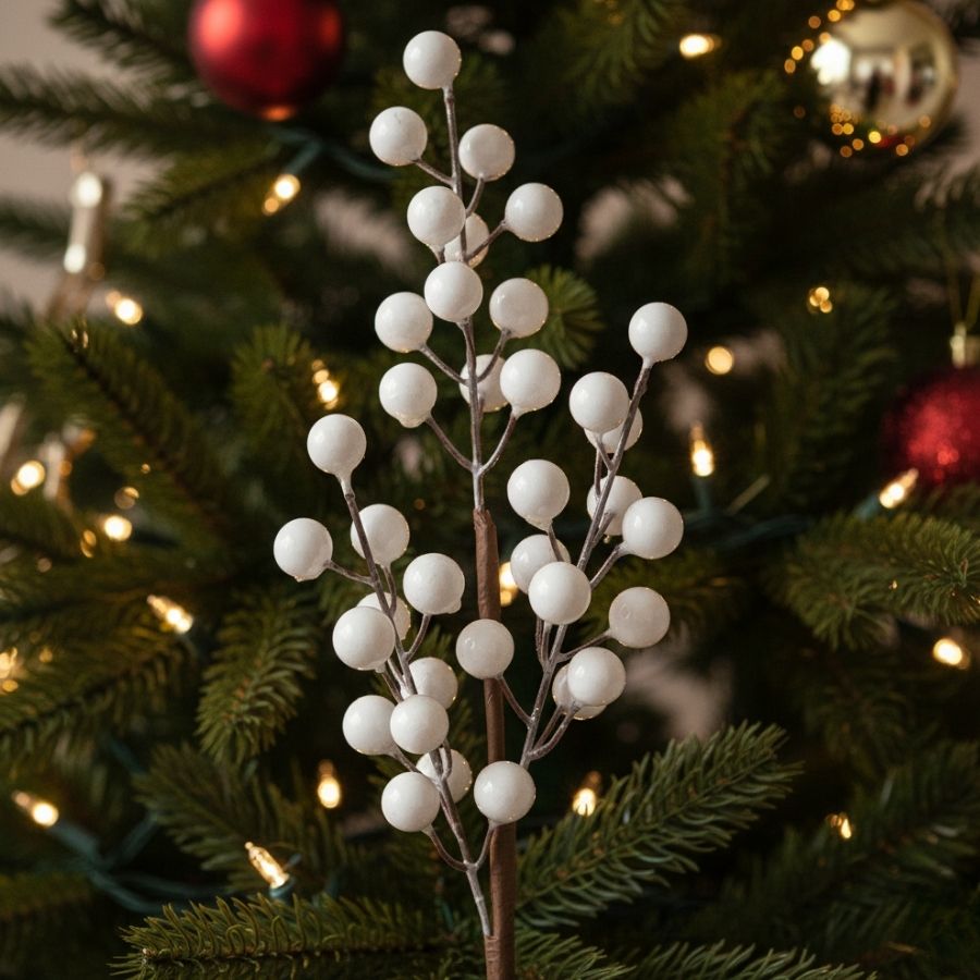 Galho decorativo de Natal Cromus Berry branco, 39,5cm, em plástico, papel e arame, ideal para árvores, guirlandas e arranjos natalinos com toque elegante e versátil.