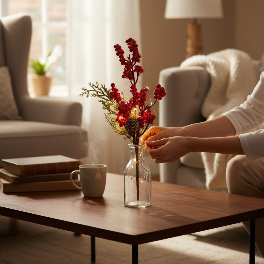 O Galho Decorativo de Natal com Frutas Vermelhas de 33cm é elegante, versátil e encantador, ideal para enriquecer arranjos e decorações natalinas com cor e sofisticação.