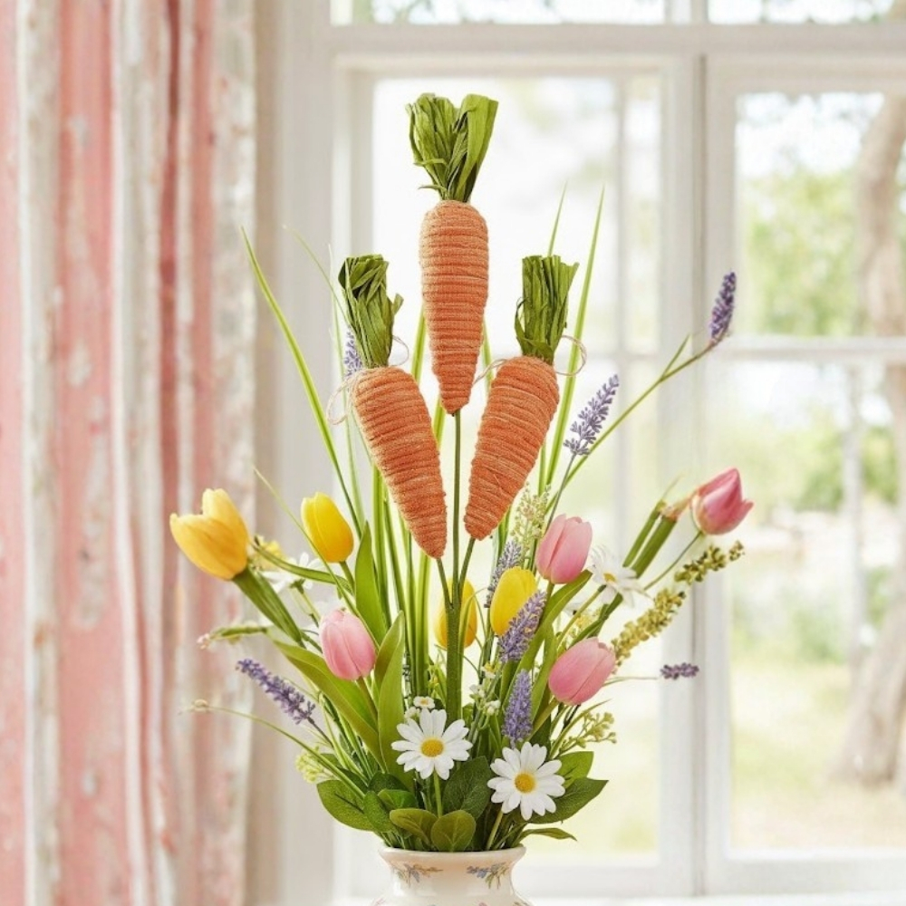 Use em vasos decorativos, arranjos de mesa ou junto a outros elementos de Páscoa, como coelhos, ovos e flores artificiais. Combine com tons neutros ou naturais para destacar as cenouras e criar uma composição harmoniosa.