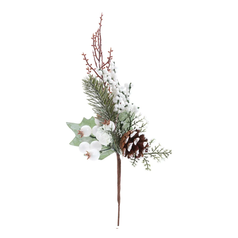 Pick decorativo, de galho com folhas, pinhas e frutas brancas cobertos por neve