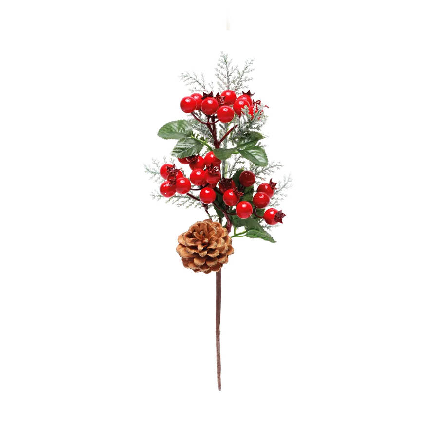 Galho decorativo com folhas,frutas e pinha, na cor verde e vermelho. Este galho mede 25 cm. Perfeito para arranjos natalinos, decoração de mesa e outro enfeites de Natal.