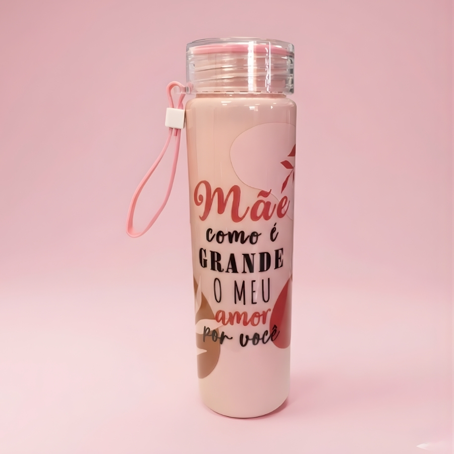 Garrafa fabricada em material plástico, com capacidade de 500ml. Acabamento na cor rosa, com estampa da frase “Mãe Como é Grande o Meu Amor Por Você”. Indicada para armazenamento de bebidas. Recomenda-se higienizar antes do primeiro uso. Consultar o rótulo para informações sobre resistência térmica e compatibilidade com líquidos quentes ou frios. Não utilizar em micro-ondas, salvo indicação expressa do fabricante. Evitar quedas, impactos e produtos abrasivos para preservar a estampa e a integridade do material.