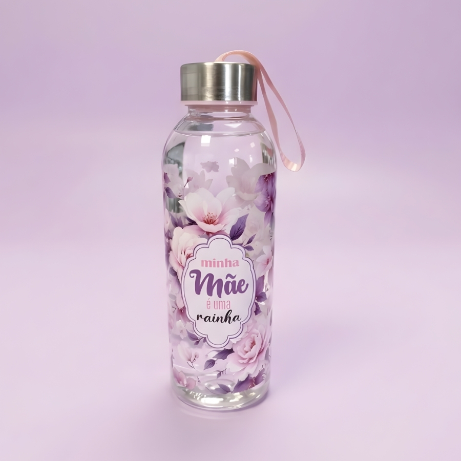 Garrafa fabricada em material plástico transparente, com capacidade de 550ml. Possui alça para transporte. Estampa floral nas cores roxo e rosa com a frase “Minha Mãe é Uma Rainha”. Indicada para armazenamento de bebidas. Recomenda-se higienizar antes do primeiro uso. Consultar o rótulo para informações sobre resistência térmica e compatibilidade com líquidos quentes ou frios. Não utilizar em micro-ondas, salvo indicação do fabricante. Evitar quedas, impactos e produtos abrasivos para preservar a estampa e a integridade do material.